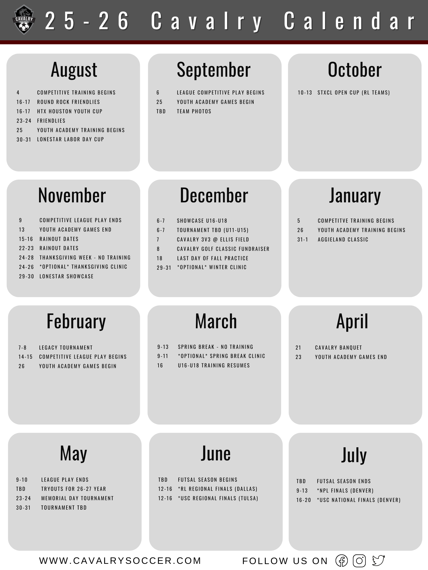 ⚽️Have you seen the calendar of events on our website? There is a lot of great information on the website, from uniform ordering, financial assistance, and our code of conduct ⚽️👍 ... #cavalryyouthsoccer #cavalrysoccer #cavalryyouthButton